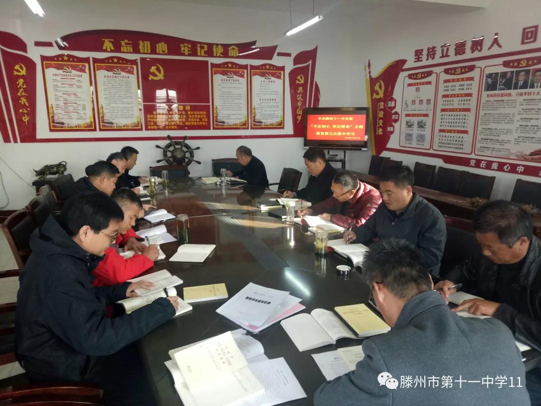 2019年11月15日上午,十一中党支部在党员活动室开展了“不忘初心、牢记使命”主题教育读书班第九次集中学习活动,全体领导班子参加,支部副书记孙卓浩主持。本次学习的主题是“作风建设、廉洁自律”。 副书记孟前进领学《习近平关于“不忘初心、牢记使命”论述摘编》第八部分183—202页:坚决整治形式主义、官僚主义,加强真抓实干的作风建设。孙书记强调,党员干部是教师的表率,楷模,就应以实际行动,在本职岗位上有所担当作为,真正做到真抓实干,务实求效,用成绩向大家展示党员的风采。